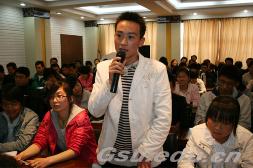 在轻松、热烈的氛围中,史校长与团学干部进行了自由交流。人文学院、美术系、政法系等院(系)的团学干部分别从就业、校区建设、学校发展等方面向校长提出问题,史校长认真、坦诚、幽默地一一做了解答。讲课和交流过程中,史校长以其丰富的知识及亲和力赢得了学生们的阵阵掌声。