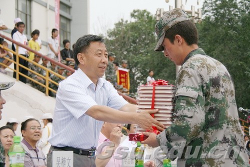 汇报表演结束后,史百战校长代表学校向承训单位赠送了锦旗,党委副书记汪建华同志宣读了《关于表彰2009级学生军训先进集体和先进个人的决定》,与会领导向获奖集体和个人颁发了获奖证书。