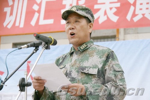 甘肃省陆军预备役师参谋长吴榜文同志作了热情洋溢的讲话。他说,通过短短十几天严格规范的军训和军事化管理,同学们从精神面貌和日常规范上已焕然一新,希望同学们牢记军训经历,在今后学习、工作和生活中继续保持和发扬军训中的优良作风,以积极的姿态迎接各种挑战。