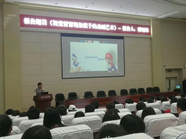 报告会上,韩延峰硕士首先以经典游戏和著名影视为引导,带领学生走进动画,了解动画的发展历程,简述了视觉暂留现象的发生于原因。使学生对视觉暂留技术有了基本的认识和理解。随后韩延峰硕士依次讲解了交互动画、影视动画等动画种类,并介绍动画中的四大主流类型:二维动画、三维动画、定格动画、游戏动画,同时针对游戏动画进行了深入的讲解。很好的拓展了我院学生对动画的认知领域,极大的提高我院学生对动画的兴趣。最后,韩延峰博士向同学展示自己工作以来的成果,并向学生介绍目前动画行业的就业前景及就业方向。他讲到:面对未来的动画行业,你们要有自己的理想,并充满希望。现在的自己一定要充实专业技能,热情的面对未来,做自己心中的选择,动画行业的发展会因为你们越来越强大。