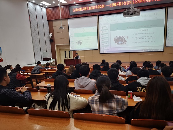 为进一步提高新闻学子的专业能力,加强舆论意识,11月12日下午,我院特别邀请了甘肃省广播电视总台都市频道副总监董志强做了以《全媒体环境下加强突发公共事件舆论引导能力的几点策略—以新冠肺炎防控的信息传播为例》为主题的讲座。19新闻班、19数字出版班、20新闻班、20广电班全体同学参加了此次讲座。