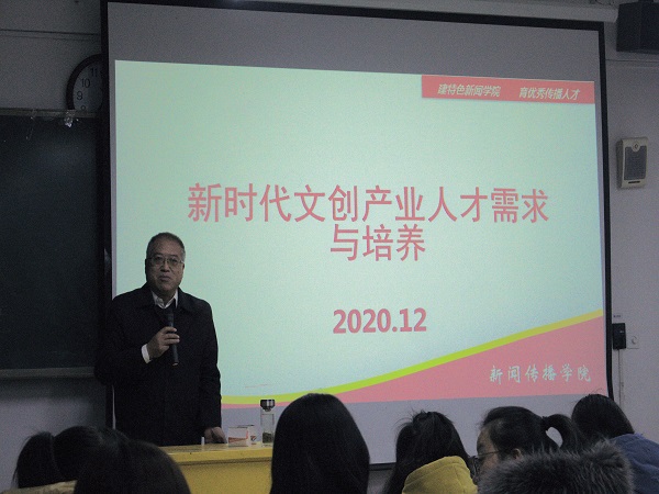 2020年12月24日晚上19:00,新闻传播学院党总支书记王金寿教授,在3-604教室为我院师生做题为《新时代文创产业人才需求与培养》的讲座。