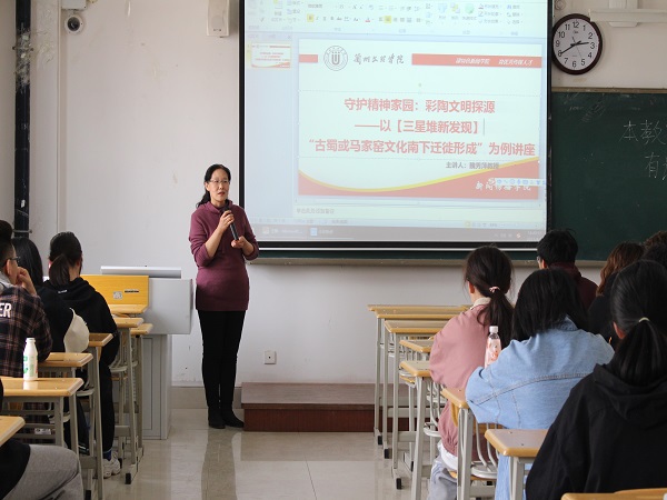 4月1日下午14:30,魏秀萍教授在3-704开展了题为“守护精神家园:彩陶文明探源”的学术讲座。为同学们讲述了以三星堆新发现,“古蜀或马家窑文化南下迁徙形成”为例的平行时空文化探源。20级广播电视学班、20级数字出版班、20级播音与主持艺术班参加了此次讲座。