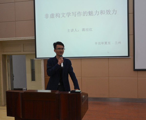 为庆祝中国共产党成立100周年,引领青年学子聆听时代声音、紧握时代脉搏,讲好中国故事、甘肃故事、文理故事、身边故事,校团委、文学院近期共同举办“庆建党百年 展时代新篇 ”主题征文暨第三届非虚构写作比赛系列活动。5月7日,系列活动专题讲座第二讲在综合楼5-205教室开讲,文学院蒋应红老师以“非虚构文学创作的魅力与效力”为题,为各学院学生代表160人多作了一场专题讲座。