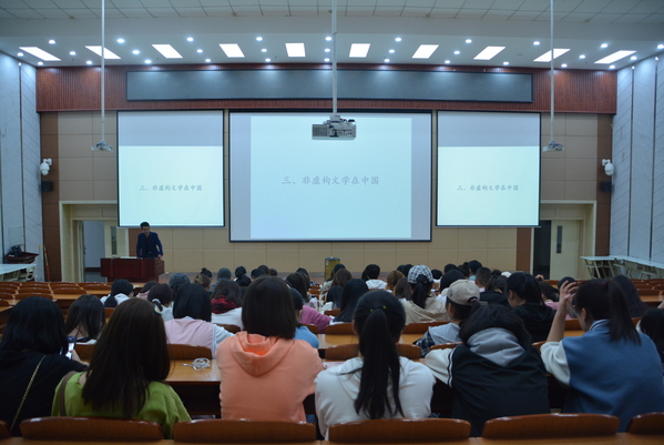 蒋应红老师的讲座由“非虚构文学写作的缘起”引入,介绍了非虚构文学的开山之作——《冷血》;以普利策非虚构小说奖获奖代表作品及2015年诺贝尔文学奖获得者阿列克西耶维奇的作品为例阐述了非虚构文学写作的特点,并以作品创作与传播为主线介绍了非虚构文学在中国的发展;围绕“非虚构文学写作回应精准扶贫”“非虚构文学创作记录乡村世界的变迁”“非虚构文学创作的自我呈现”“冯骥才先生的非虚构文学创作”“非虚构文学创作在历史的现场”“非虚构文学创作中的牧民生活”六个方面,对近年来诞生的非虚构文学作品作了系统梳理与解读。他勉励同学们热爱生活、热爱阅读与写作,培养人文情怀,回归童真、回归自我、坦率表述,从现实生活中寻找写作灵感与素材,激发创作热情和想象力,让自己的想象不只停留在还原生活阶段,而必须上升到解读和创新阶段。蒋老师的讲座激发了同学们对非虚构写作的浓厚兴趣,深化了对非虚构写作的认识,围绕相关话题与蒋老师进行了互动交流。