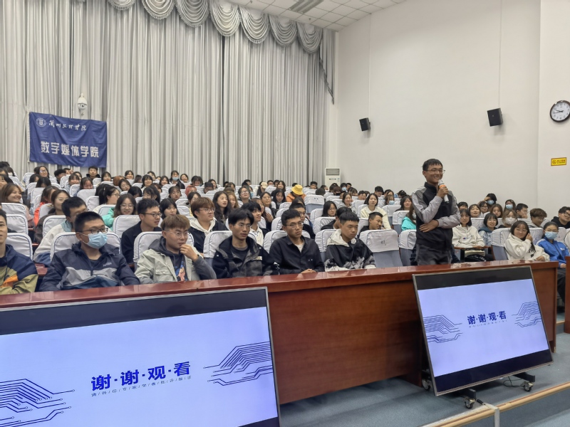 在讲座中,闫教授首先向同学们介绍了在我国工科类院校中艺术学院的现状与困境,其主要是缺乏明确的办学目标和相应的学科规划,以及随着计算机通信技术的普及,工科高校艺术学院的学科建构和发展模式没有发生根本性变化。闫教授指出:新文科不是生硬的跨专业叠加,而是面向未来社会的认知重启与专业生态重构,新文科的本质内涵是当代人对新科技、新媒介所引发的社会新现象、新问题和新变化的一次认知重启。最后,闫教授通过视频向学生们展示了许多技术与艺术结合的优秀案例,介绍了新文科背景下艺术学科如何调试,以及他的团队创作的作品,包括数字沙盘、基于增强现实技术的文化宣传等。闫教授还与在场学生进行了热烈的互动交流。
