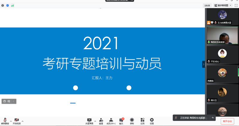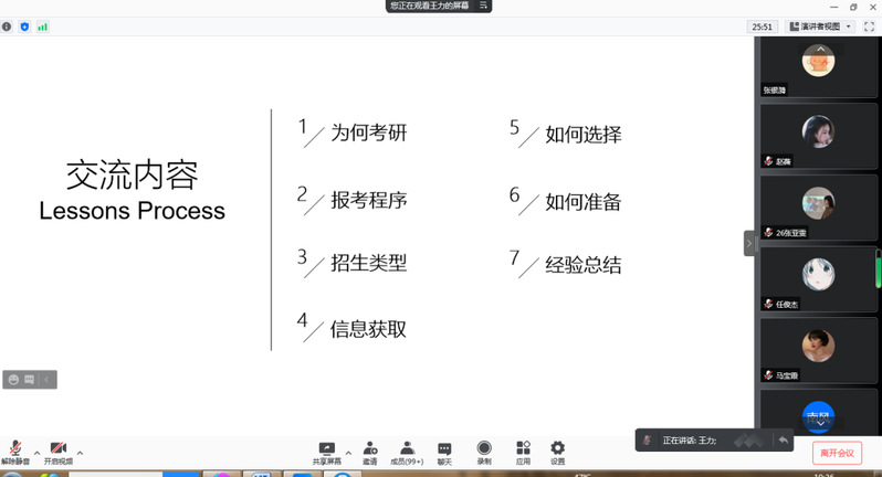 王力博士针对“为何考研、报考程序、招生类型、信息获取、如何选择、如何准备、经验总结”共7个方面与学生进行了交流。重点分享了公共课和专业课如何备考,初试、复试、调剂如何联系导师,普及了专业硕士和学历硕士的区别,告诫同学们在面对不同专业、不同学校时如何选择等问题。