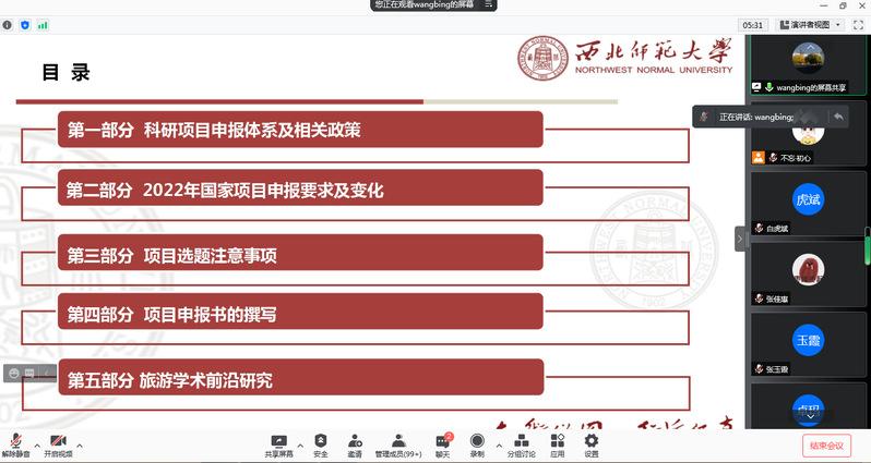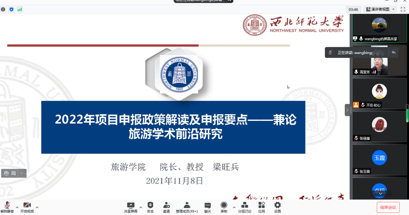 梁旺兵教授围绕“2022年项目申报政策解读及申报要点——兼论旅游学术前沿研究”主题,从“科研项目申报体系及相关政策、2022年国家项目申报要求及变化、项目选题注意事项、项目申报书的撰写、旅游学术前沿研究”共5个方面与学院师生进行了交流。重点针对2022年各类项目的申报进行了指点和答疑。针对学院教师提出的科研难题、申报项目的困境、研究方向的转型、学术研究热点等问题给予了耐心解答和倾情传授。针对学生提出的跨专业考研、就业意向、毕业论文撰写等问题也一一给予了详细解答,讲座现场气氛热烈。