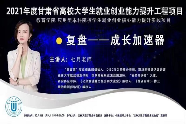 为帮助同学们提升自身能力,掌握必要的求职技巧,2021年12月4日19:00-21:00教育学院和“应用型本科院校学生就业创业核心能力提升实践”项目组,邀请“高言值”复盘俱乐部创始人、DISC行为特质分析师、职场幸福课认证讲师、兰州大学就业创业导师、国家高级职业规划师--七月老师,为大家开展了题为《复盘—成长加速器》的专题讲座。本次讲座由招生就业处副处长杨光主持,全校学生3000余人在线聆听。