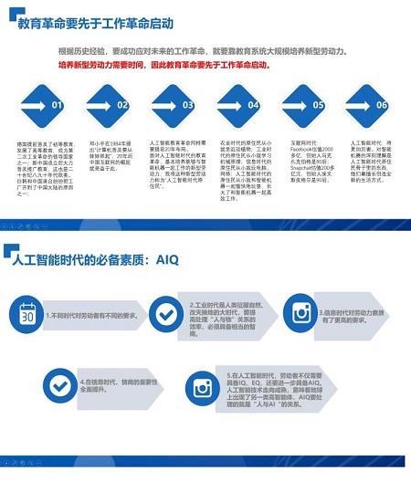 董小平强调“教育革命要先于工作革命启动”,根据历史经验,要成功应对未来的工作革命,就要靠教育系统大规模培养新型劳动力。培养新型劳动力需要时间,因此教育革命要先于工作革命启动。