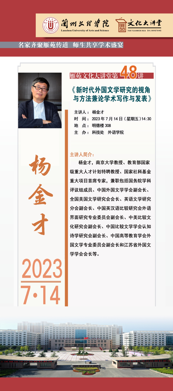 雁苑文化大讲堂第48讲——《新时代外国文学研究的视角与方法兼论学术写作与发展》讲座预告
