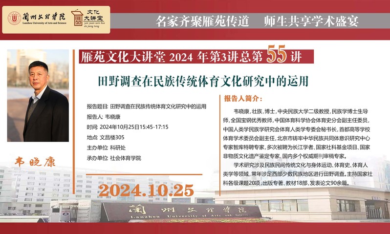 雁苑文化大讲堂——《田野调查在民族传统体育文化研究中的运用》讲座预告(总第55讲)