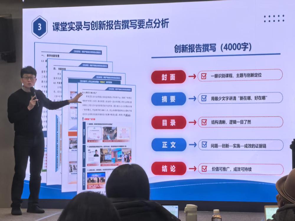 参训教师认真聆听专家讲解,结合自身课程实际,主动对标国赛高水平成果,在教学设计创新、成果凝练及数字化赋能等方面进行深入研讨,进一步明确了备赛方向与改进重点。