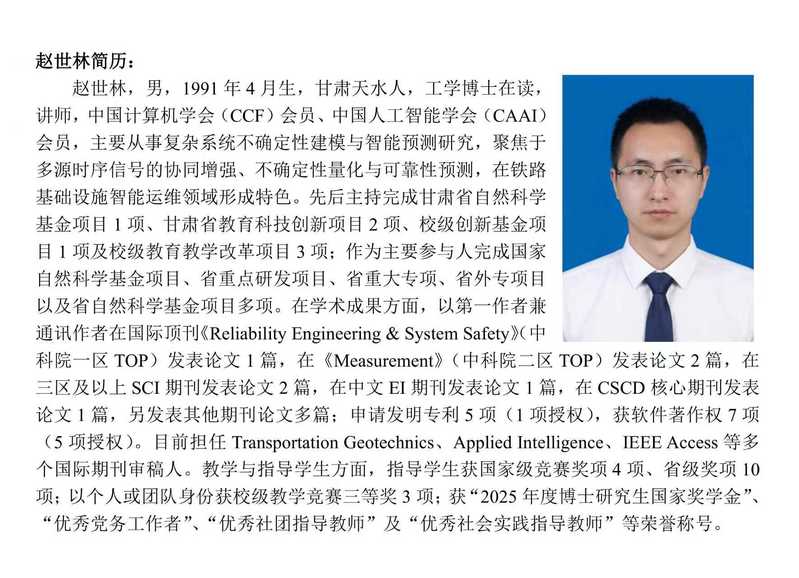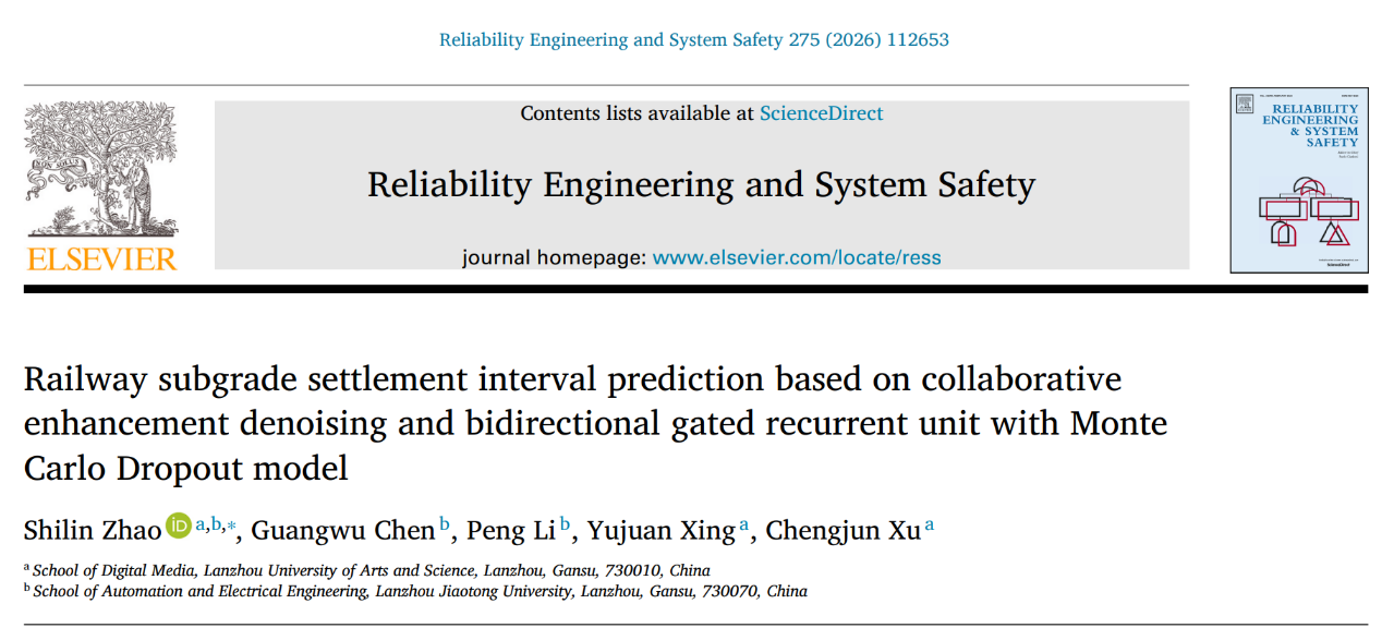 近日,taptap点点数字媒体学院(计算机学院)青年教师赵世林在国际可靠性工程领域顶级期刊《Reliability Engineering & System Safety》(简称RESS)上发表题为《Railway subgrade settlement interval prediction based on collaborative enhancement denoising and bidirectional gated recurrent unit with Monte Carlo Dropout model》的研究成果。该期刊实时影响因子12.2,h指数为119,多年持续入选中国科学院工程技术领域一区TOP期刊,是国际公认的可靠性工程领域权威期刊。