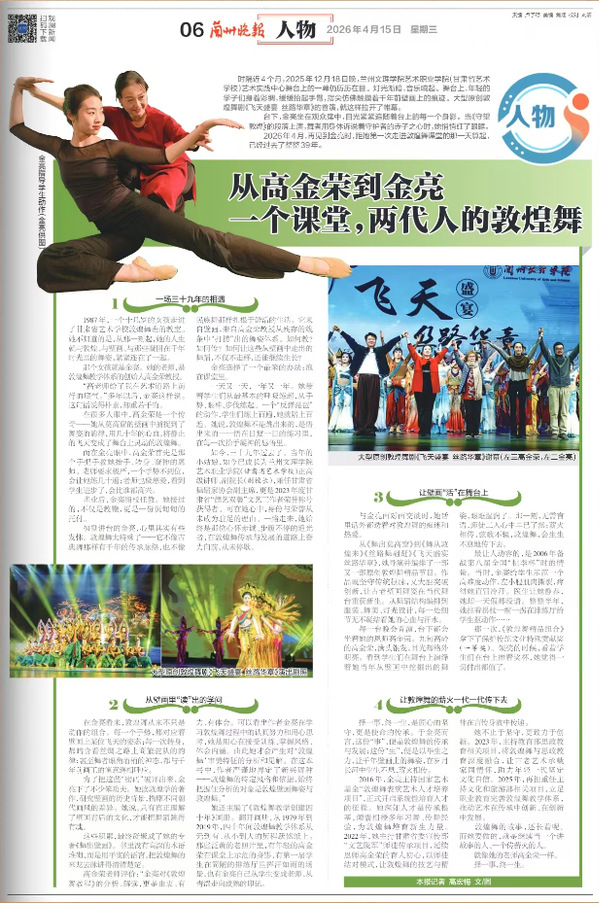 4月15日,《兰州晚报》以《从高金荣到金亮:一个课堂,两代人的敦煌》为题,专版报道taptap点点高金荣教授与金亮老师两代敦煌舞人的课堂接力与传承故事。